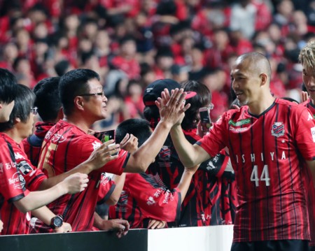 上写真/移籍あいさつのサンクスウォークで、ピッチサイドのサポーターと笑顔でハイタッチ