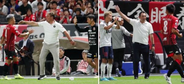上:左側写真/後半38分、札幌MF菅(左)に代わって中野を投入したのに伴い、守備の指示をするペトロビッチ監督、右は菅を労う四方田ヘッドコーチ