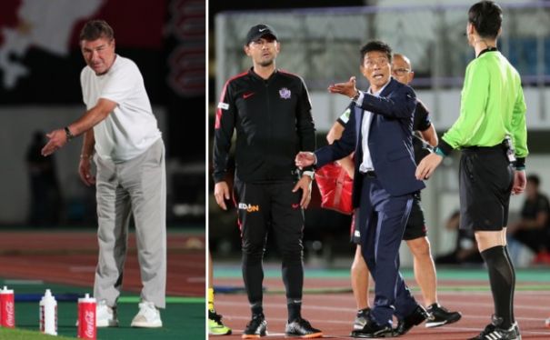 上:右側写真/後半4分、広島DF荒木のレッドカードの判定に激しく抗議する城福浩監督
