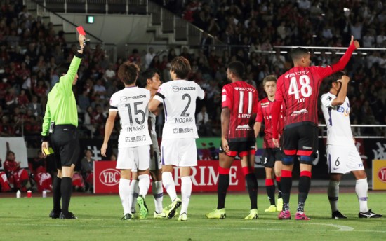 上写真/後半3分、札幌のロングパスにFWジェイ(48番)と競り合った際、広島DF荒木がハンドの判定、2枚目のイエローカードで西村主審がレッドカードを上げる。MF稲垣(15番)、DF野上(2番)、その奥が荒木