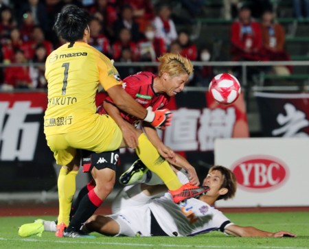 上写真/後半6分、広島DF荒木のハンドで得たFKを札幌DF福森(5番)が直接決め同点とする