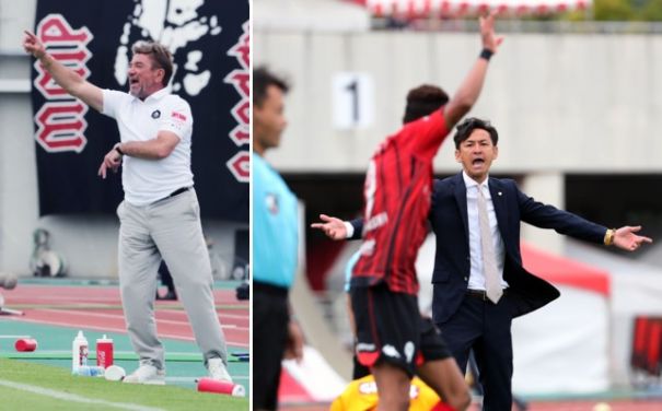 上:左側写真/後半35分、懸命に指示を出す札幌のペトロビッチ監督、そのかいもなく5分後、ダメ押し点を入れられる