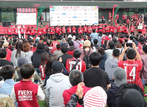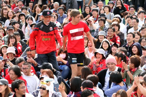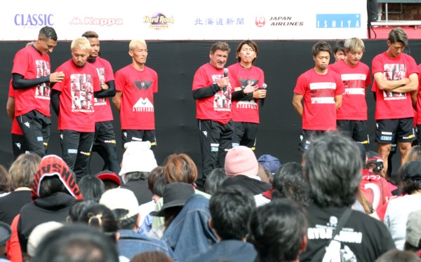上写真/9月22日、札幌市内の白い恋人サッカー場で行われた北海道コンサドーレ札幌のサポーターズデー。大勢のサポーターの前に勢ぞろいしたスタッフと選手たち。写真はいずれも撮影・石井一弘