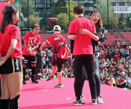 上写真/ジェスチャーゲームで中野選手に抱きついて喜ぶ女性サポーター、中野選手は照れて緊張気味? 奥でチャナティップ選手も少年サポーターと交流