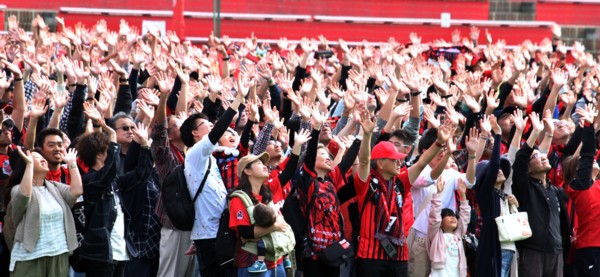 上写真/撮影するドローンに向かって手を振るサポーターズデーに参加した人たち、試合で応援するような光景だ