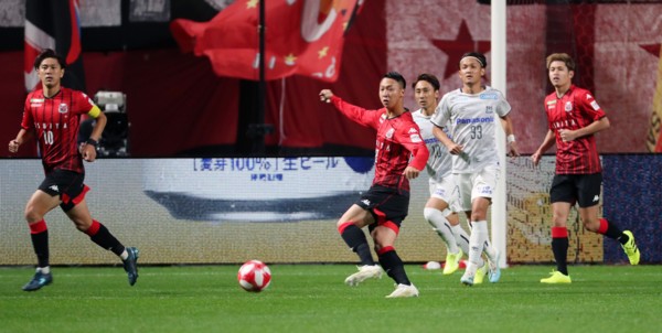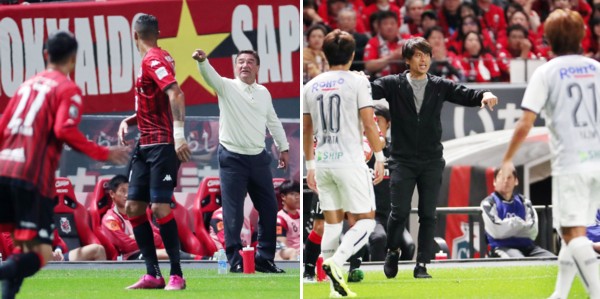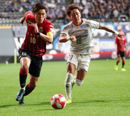 札幌がFWジェイにボールを配して、両シャドーの武蔵、荒野拓馬が受け手になっての攻撃を試みる。一方のガンバは2トップで宇佐美とアデミウソンが両脇からのセンタリングに合せる。