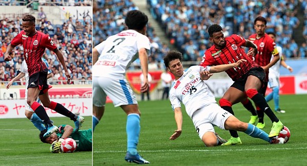 上:右側写真/後半42分、札幌MFアンデルソン・ロペス(11番)と川崎の五輪世代のMF田中(25番)が激しくマッチアップ