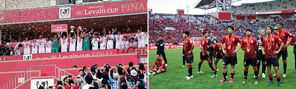 上:左側写真/「ルヴァンカップ」などを掲げて喜ぶ川崎フロンターレの選手たち、紙吹雪が舞う