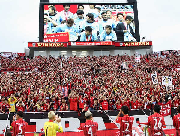 上写真/準優勝してあいさつする札幌の選手たちに、満員のスタンドのサポーターたちから感謝の声援が贈られた。大型の電光掲示板は皮肉にも優勝した川崎の選手たちの喜びの記念写真の様子を写し出していた