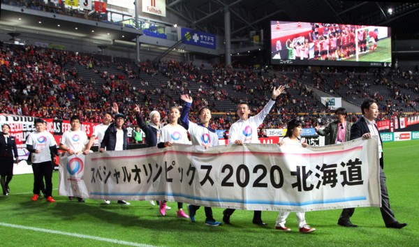 上写真:11月2日、名古屋戦の試合終了後、元札幌の河合氏らが「スペシャルオリンピックス2020北海道」の横断幕を掲げ場内を一周、サポーターに告知した。スペシャルオリンピックス日本のドリームサポーター・森理世さん、スキージャンプの葛西選手、小林選手も一緒に歩き応援を呼びかけた(札幌ドーム、撮影・石井一弘)