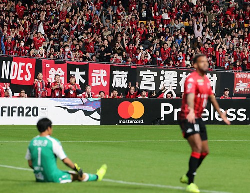 上写真/後半6分、アンデルソン・ロペスのゴールが決まり、同点と思った札幌サポーターが立ち上がって一斉にバンザイ。磐田GK八田(1番)は、「やられたー」という感じ、ロペスは両手を広げて「なぜ?」とアピール