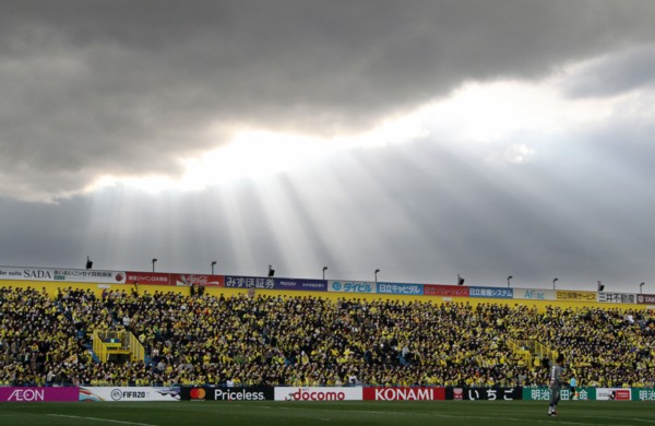 上写真/前半34分、1点を返す絶好のチャンスだったが、「残念!!」と思いながら見上げた空の雲間からバックスタンドまで埋めた柏ファンの頭上に“後光”が差していた。あたかもホームの柏を後押ししているようではないか。手前の柏GKキム・スンギュが手持無沙汰の様子。