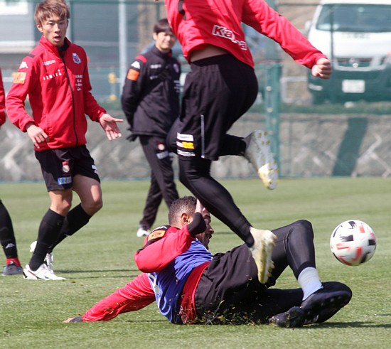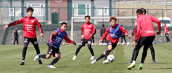 GK陣は、ク・ソンユンが遅れてきたが、5人がそろって、それぞれ別メニュー。グラウンドプレーヤーはFWジェイ―オリベイラとブロック陣。FW鈴木武蔵―アンデルソン・ロペスとブロック陣の2手に分かれてFW陣の「ハイプレス」の実践的な練習。カットはするものの、FWの2人のパスまでは、見せなかった。
