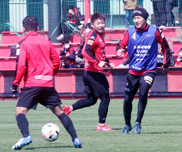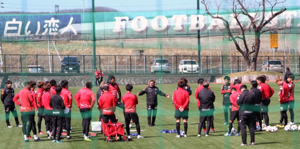 上写真/ミーティングを行う北海道コンサドーレ札幌の監督・選手・スタッフたち。(写真はいずれも4月3日、札幌・宮の沢白い恋人サッカー場、撮影・石井一弘)
