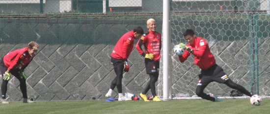 上写真/病気のため別メニュー調整中のGKク・ソンユンに代わって誰が正GKの位置を獲得するか? 左からGK菅野、新加入で長身の中野、タイから新加入のカウィン、阿波加