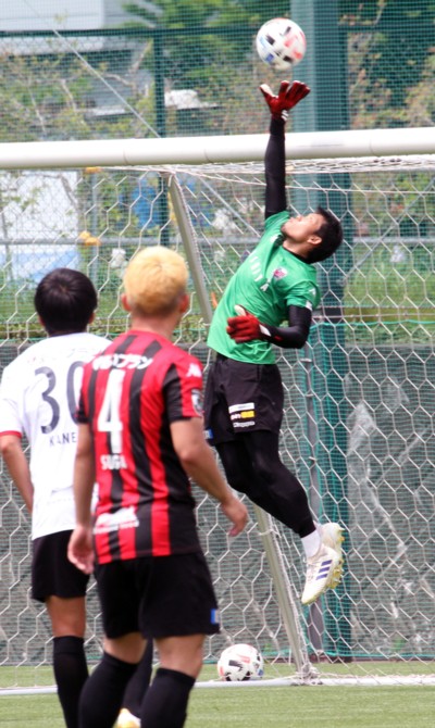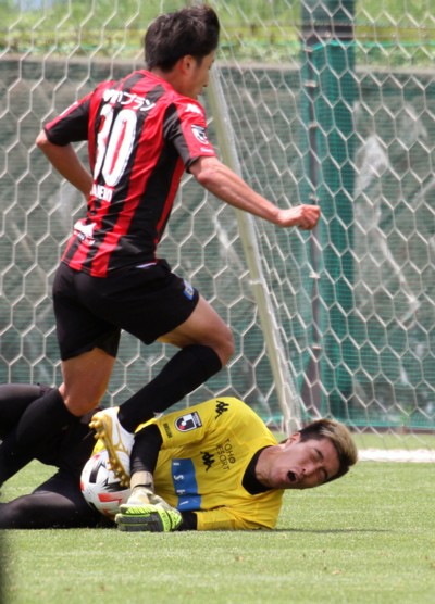 上写真/MF金子の足元に飛び込みセービングするGK阿波加