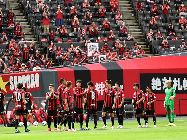 上写真/北海道コンサドーレ札幌は228日ぶりとなる本拠地での試合を迎え、コロナ感染予防のため入場制限で座席の間隔をとったスタンドのサポーターに温かい拍手で迎えられた。左からキャプテンMF宮澤(10番)、菅、FWジェイ、DF福森、大学卒新人の田中、MF深井(8番)、DF進藤、MFルーカス・フェルナンデス、駒井、チャナティップ、GK菅野