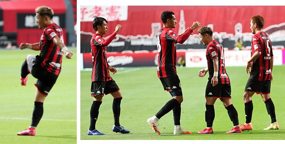 上:右写真/前半追加タイム2分、札幌MF菅(4番)が先制ゴールを決めDF田中(左端)、FWジェイ(48番)、DF福森(5番)らに祝福される