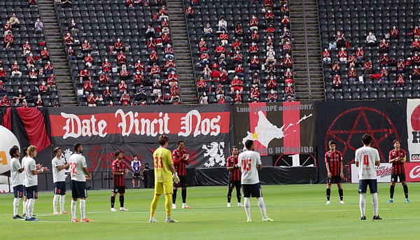 キックオフの前に、札幌の選手たちと対戦相手のFC東京の選手たちが「ソーシャル・ディスタンシング」を保ち円の形で、サポーターとともに医療従事者へ拍手で感謝。