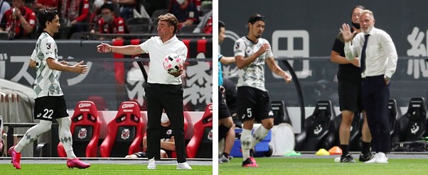 上:左側写真/後半開始早々、タッチを割って自分の所に飛んできたボールを、スローインする神戸MF西に渡す札幌のペトロビッチ監督