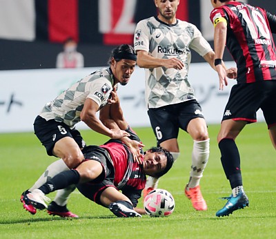 上写真/前半40分、日本代表の神戸MF山口(5番)と激しくボールを奪い合う大学卒のルーキーで2戦連続で先発起用されているDF高嶺(下)、この後体勢を立て直し前線にパスを出す強さを見せた。その右、神戸MFサンペール(6番)、右端札幌MF宮澤(10番)
