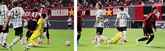 上:左側写真/後半3分、札幌MF荒野(27番)が右からの駒井のクロスに、神戸GK飯倉に体をぶつけるようにしてボールを押し込み同点ゴールを決める。飯倉の後方元札幌の神戸MF西、荒野の左は神戸MF酒井(24番)