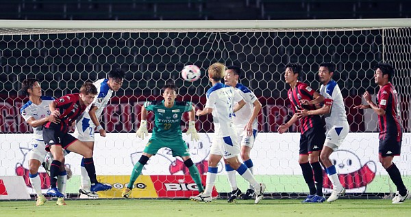 先行したのは大分で前半終了間際、アディショナルタイム2分の47分、大分がCK(コーナーキック)を得る。MF長谷川雄志がキック、中央付近にいたDF香川勇気が合わせるがGK菅野がはじき出す。再び前にいたFW伊佐耕平が押し込み、終了間際に得点にした。