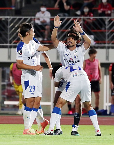 上写真/前半追加タイム2分、大分FW伊佐(右奥)が先制ゴールを決め、DF岩田(29番)、FW三平(右手前)らに祝福される