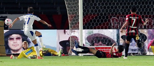 上:右側写真/後半22分、FW高澤がGKとの1対1となり、菅野に好セーブされた時、両手を大きく広げた大分の片野坂知宏監督