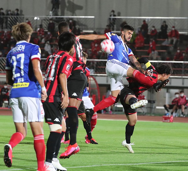 上写真/前半7分、右CKから横浜FMのDFチアゴ・マルチンスの攻撃を身を挺して守る札幌MF荒野(右端)