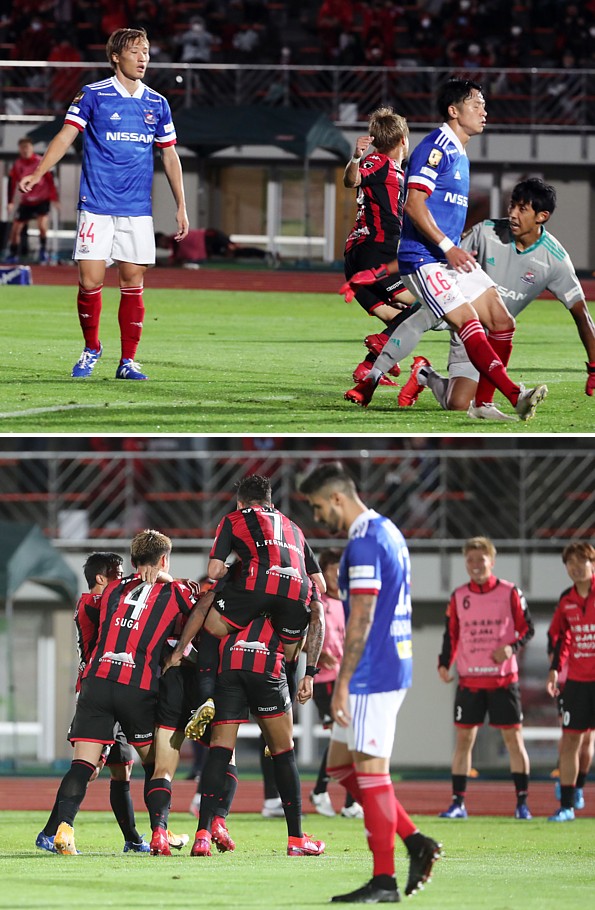 上:上段写真/後半8分、札幌MF駒井(左から2人目)に先制ゴールを決められ、ガックリの横浜FMのDF畠中(44番)、高野(16番)、右端GK朴一圭