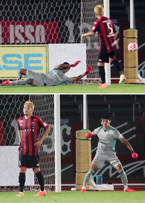 上:下段写真/PK戦で5人目の札幌DF福森(左)のPKを阻止して「どうだー!!」と言わんばかりの横浜FMのGK朴一圭、二人の表情が対称的だ