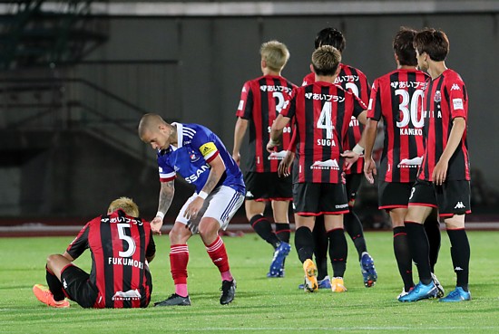 上写真/PKを外しピッチから立ち上がれない札幌DF福森(5番)を慰める横浜FMのMFマルコス・ジュニオール
