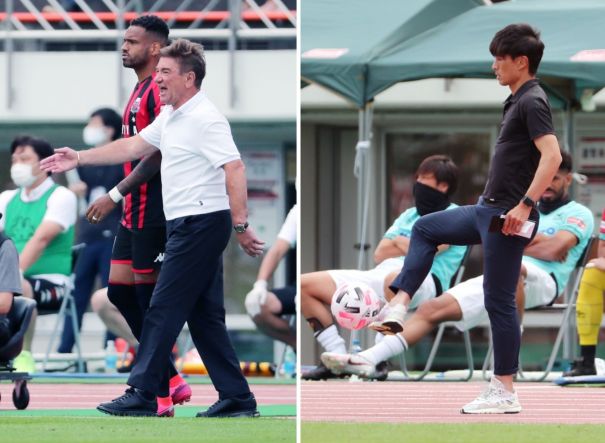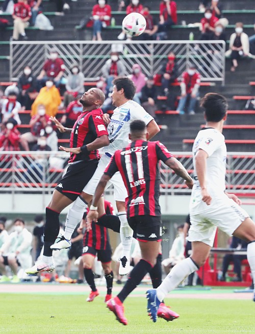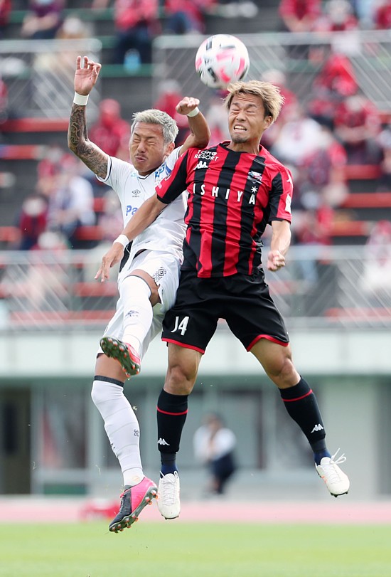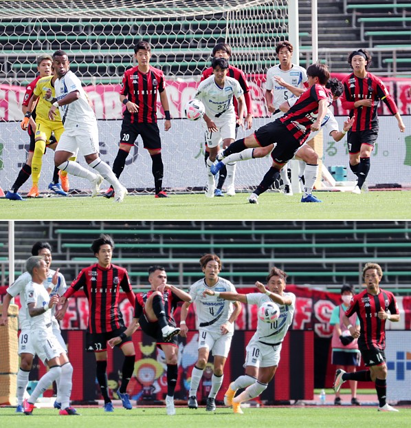 上:右側写真/前半14分、自分の所に飛んできたボールを軽妙にさばくG大阪の宮本恒靖監督、現役時代、日本代表キャプテンの記憶はまだ新しい