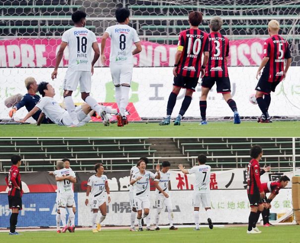 上:上段写真/後半33分、G大阪FW渡邉(左で尻餅をついている)が自分が打ったボールが跳ね返ったのを再度押し込み、先制ゴールを決める。左奥札幌GK菅野、G大阪の選手は左からFWパトリック(18番)、MF小野瀬(8番)、札幌の選手は左からMF宮澤(10番)、DF進藤(3番)、福森(5番)が、ただただ呆然とする