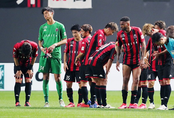 上写真/3−3と引き分け、納得いかない表情の札幌GK中野(34番)とMF小柏(35番)、1人おいてDF田中とMF金子