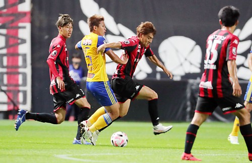 上写真/前半28分、札幌MF金子(左)が右サイドを駆け上がりストップし切り返す、仙台のDFパラ(右端)、DF平岡(中央)を翻弄した
