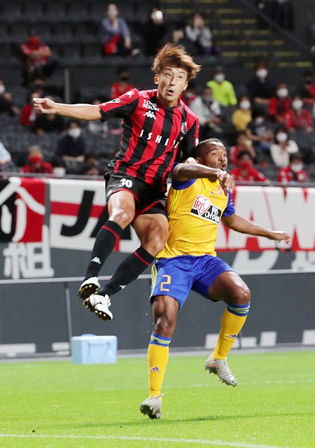上写真/前半25分、札幌の大卒ルーキーMF金子(30番)がDF福森からのロングボールを仙台DFパラ(2番)と競りながら折り返し、FWアンデルソン・ロペスのゴールをアシスト