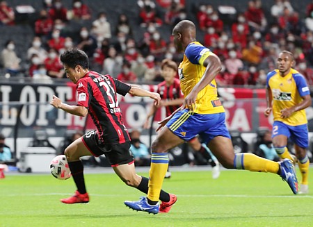 上写真/前半27分、札幌MF小柏(35番)が仙台キャプテンDFシマオ・マテをドリブルで追い抜いていく、凄いスピードだ、右端DFパラ(2番)