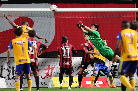 上写真/後半28分、仙台左CKからの攻撃を体をいっぱいに伸ばしてパンチングで防ぐ札幌GK中野