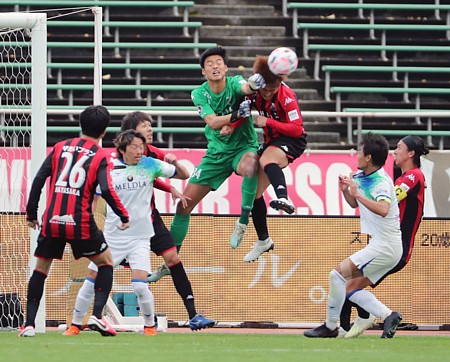 上写真/後半43分、湘南左FKからの攻撃を札幌GK中野(34番)がパンチングではね返す、その右途中出場したMF高嶺