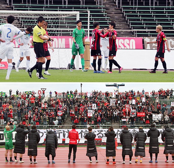 上:下段写真/久し振りの勝利を報告する札幌の選手たちと温かい拍手を送るゴール裏のサポーターたち、手前左から3人目が2ゴールで勝利の立役者になったMF金子