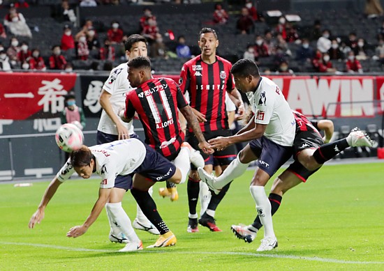 上写真/試合開始早々の1分、札幌MF荒野のクロスに駒井(右端)が飛び込むようにヘディングシュートするがゴール右にはずれる、MFアンデルソン・ロペス(11番)とその右FWジェイが久し振りにそろって先発、やはりチームが安定する