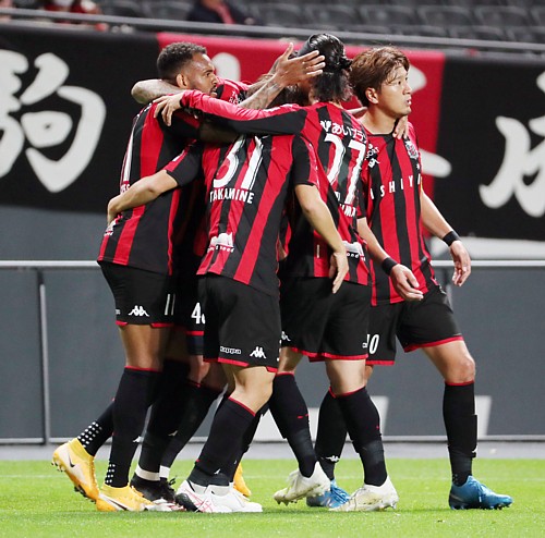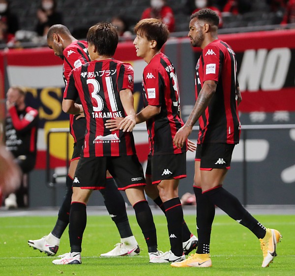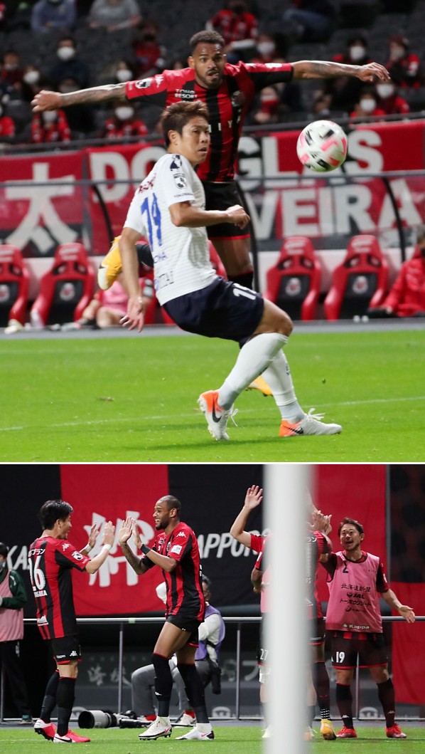上:下段写真/後半34分、FWドゥグラス・オリヴェイラが札幌でのリーグ初ゴールを決めMF早坂(左端)とハイタッチして喜ぶ。右端アシストしたMFアンデルソン・ロペス(ポストの陰)と同様にハイタッチする控えのMF白井(19番)