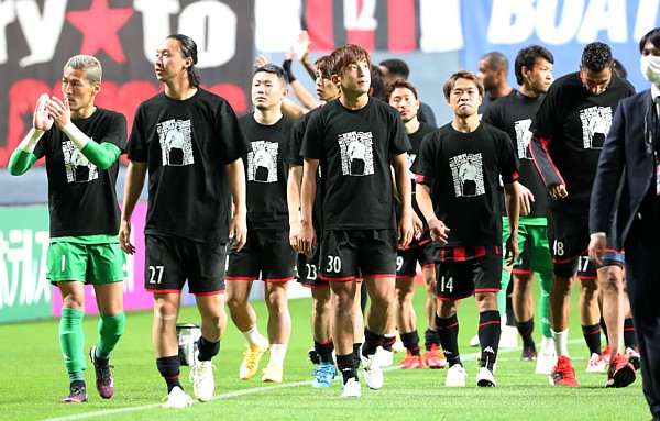 上写真/ペトロビッチ監督の200勝を記念するそろいのシャツを着てサポーターへあいさつに向かう札幌の選手たち、左からGK菅野(1番)、MF荒野(27番)、菅、中野、金子(30番)、白井、駒井(14番)、FWジェイ(48番)ら