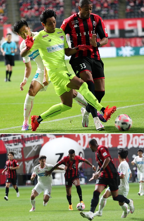 上:下段写真/前半17分、札幌FWアンデルソン・ロペス(11番)が鳥栖DFエドゥアルドと競りながらドリブルで突進、MFドゥグラス・オリベイラ(33番)が「ボールを出せ」と要求している