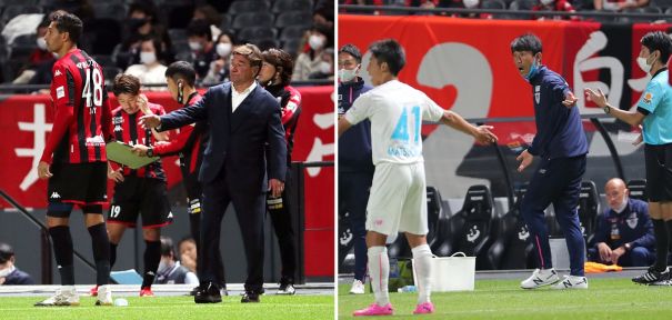 上:左側写真/後半14分、これから送り出すFWジェイ(48番)に声をかける札幌のペトロビッチ監督、中央奥でも四方田ヘッドコーチがMF白井(19番)に指示を出している