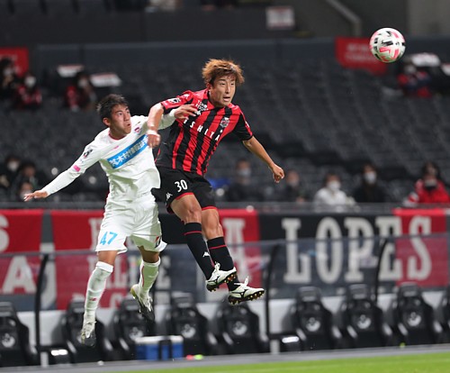 上写真/前半39分、札幌自陣のDFキム・ミンテからのロングパスをMF金子(30番)が鳥栖MF中野(47番)と競りながら頭で中央へ入れる