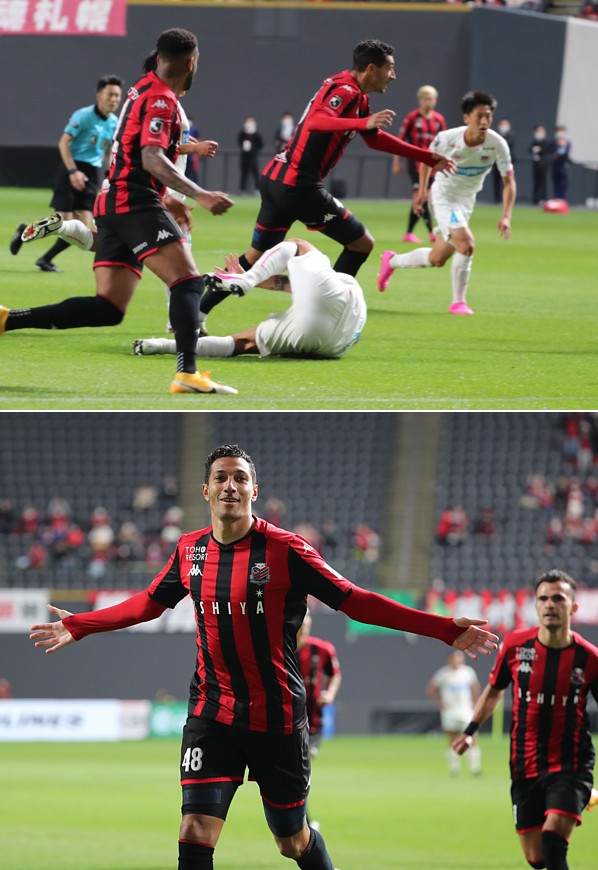 上:下段写真/後半18分、同点ゴールを決めて笑顔を見せる札幌FWジェイ(48番)、アシストしたMFルーカス・フェルナンデスが走り寄ってくる