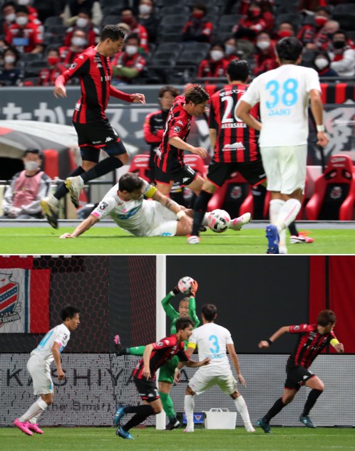 上:上段写真/前半14分、札幌DF福森のロングパスに反応したMFドゥグラス・オリベイラ(33番)が鳥栖GK朴一圭と競って倒されFKを得る